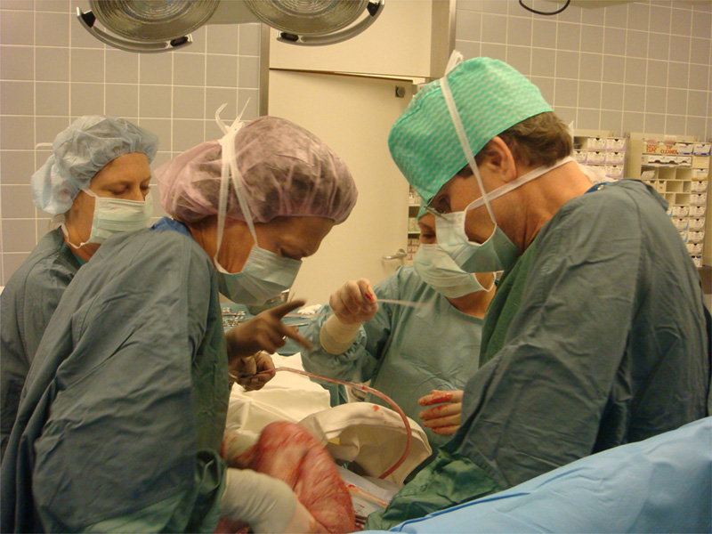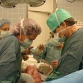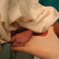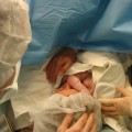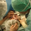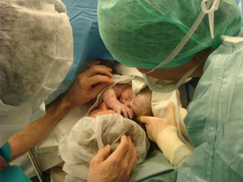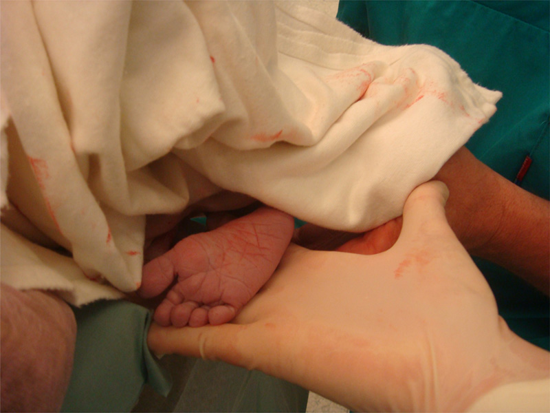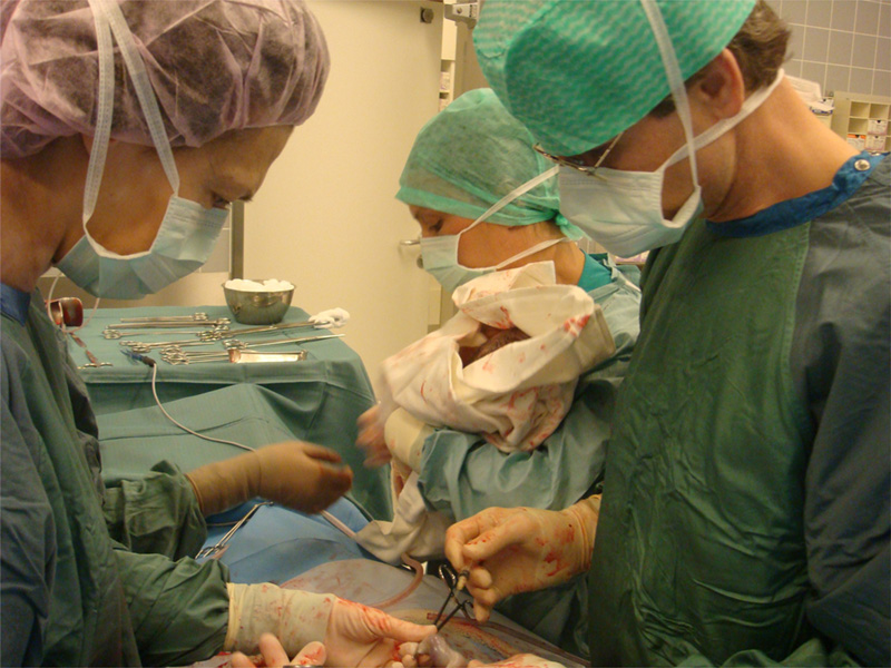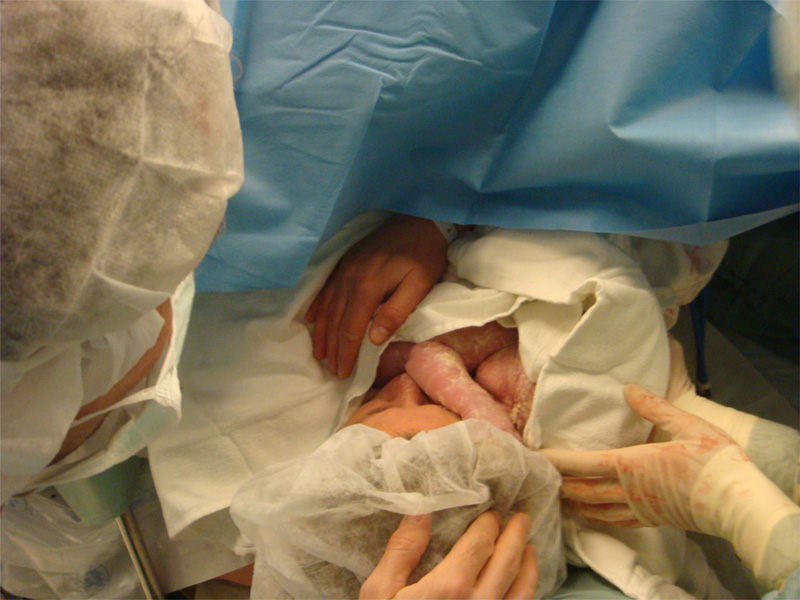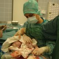 - Die Geburt des Kindes bei abgeschalteter OP Lampe und bei Raumlicht