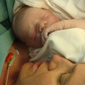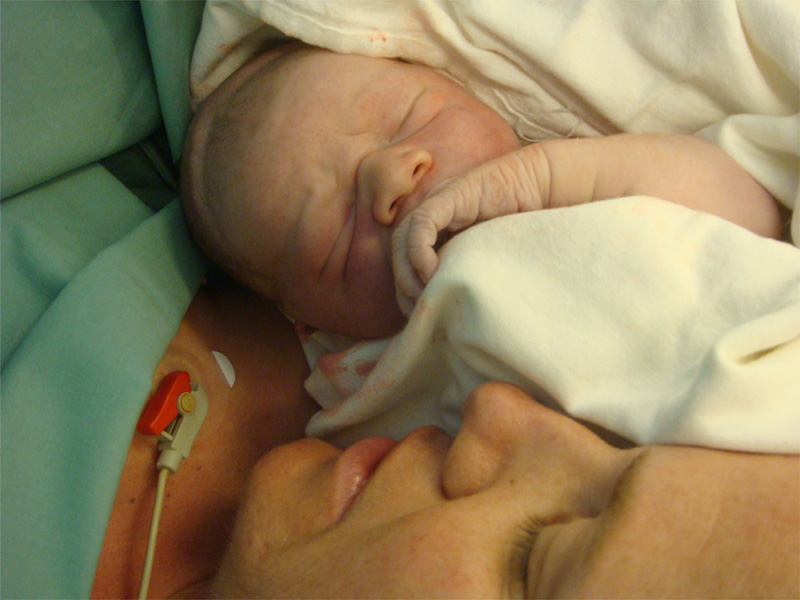 - Hebamme bringt warm eingewickeltes Kind direkt zur Mutter